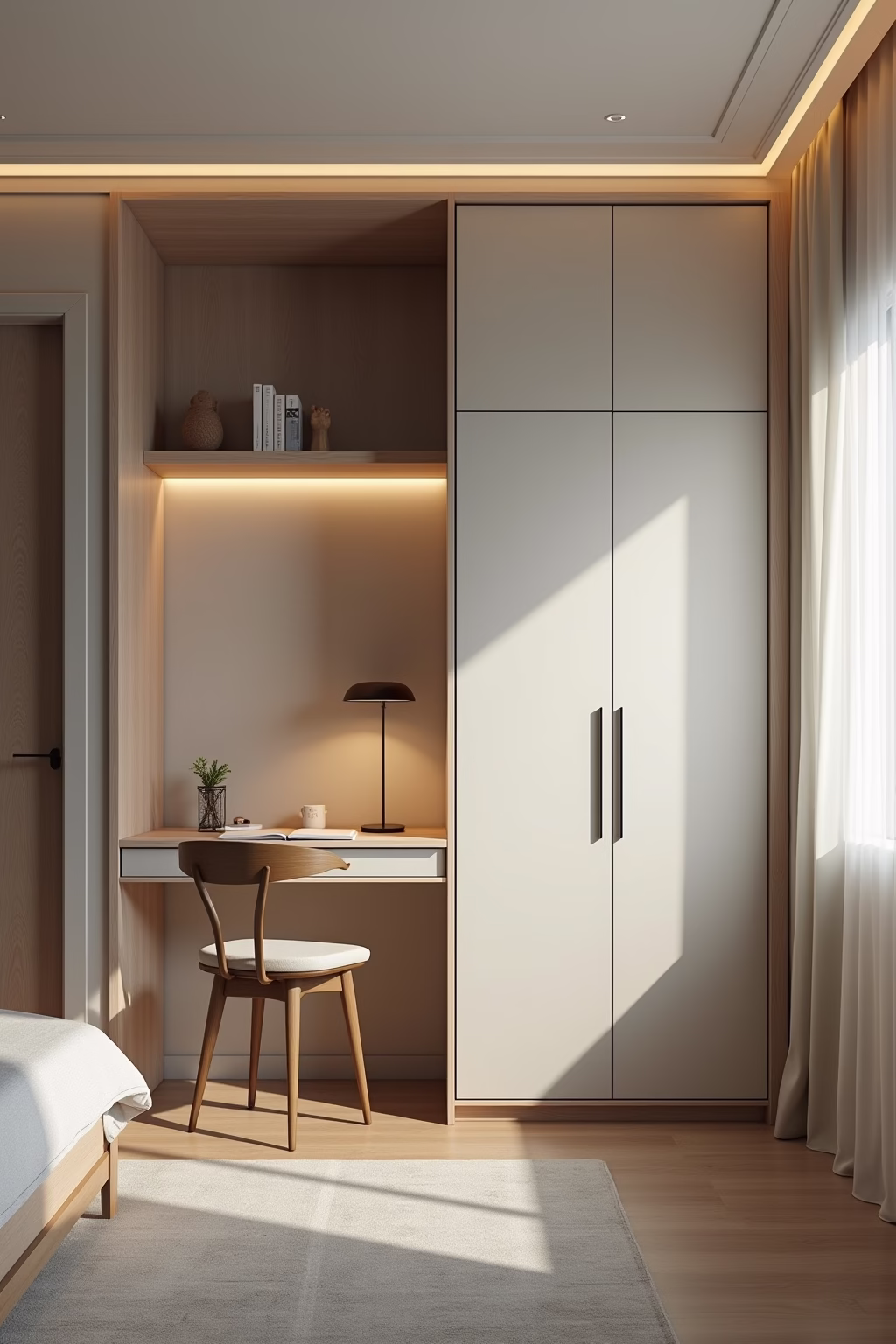 Ein integrierter Arbeitsplatz im Schlafzimmer spart wertvollen Wohnraum und ermöglicht flexible Arbeitszeiten ohne zusätzlichen Flächenbedarf.